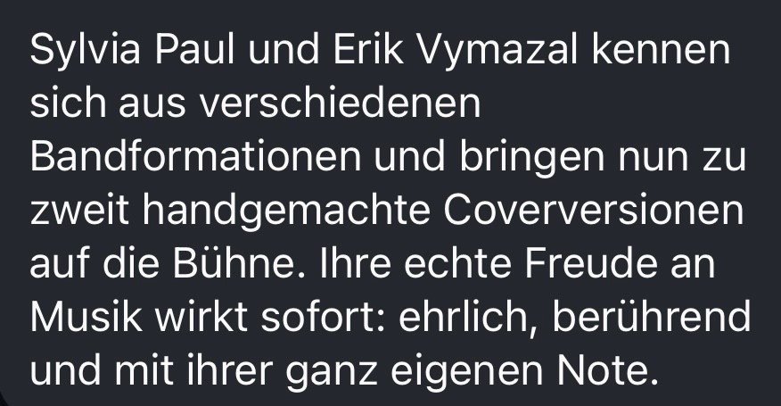 Katja und Dietmar aus Siegen, glänzen mit ihrem Charme. Ehrlich akustisch sind Spontan zu jeder Gelegenheit und dass ganz ohne Schirm oder doppelten Boden, denn Proben kann ja jeder. Bei den beiden kommt jeder auf seine Kosten. Mit Pop, Rock oder etwas aus der seichten Gitarre, alles aus 60Jahren Musik, Authentisch und akustisch mit Gesang und Gitarre interpretiert, da ist für jeden etwas dabei.