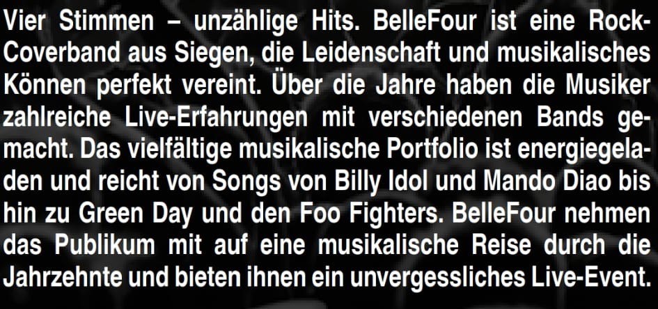 Die Musiker sind als Komponisten, sowie Studio- und Livemusiker für Wolfgang Petry, Bernhard Brink, Ireen Sheer und Jürgen Drews tätig und standen u.a. schon mit Andrea Berg, Olaf Henning, Brings, Höhner, Querbeat und Roland Kaiser zusammen auf der Bühne. Ausdrucksstarke Stimmen… ein professioneller Sound… hören Sie den Unterschied und freuen sich auf einen unvergesslichen Abend mit der Band sam!